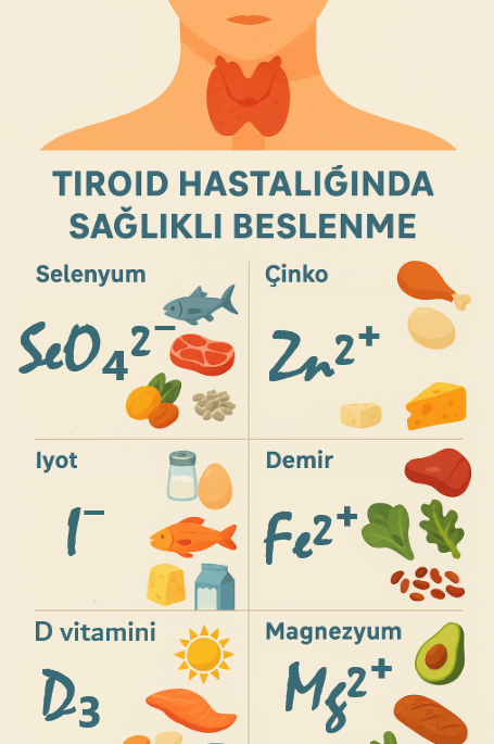 Öncelikle şunu belirtmeliyim ki, aslında genel geçer sağlıklı beslenme prensiplerine uymak ve Akdeniz tipi sağlıklı beslenme modelini uygulamak hem genel sağlık açısından hem de neredeyse tüm hastalıklar için ve özellikle tiroid hastalıkları için koruyucu ve faydalıdır. Ancak tiroidin çalışma prensiplerini ve yapısını düşündüğümüzde iyot, selenyum, çinko, D vitamini, demir, magnezyum ve B12 vitamininin tiroid için önemli vitamin ve mineraller olduğunu söylemek gerekir. Sağlıklı beslenmeyle bunları yeterli bir miktarda almak mümkün olmakla birlikte, şehir yaşamının getirdiği beslenme şekli, tarım ve hayvancılıkta üretimi artırmaya yönelik bir takım zirai müdahaleler, kötü beslenme şekli, sağlıklı olan yiyeceklere ulaşımdaki zorluklar (örneğin ekonomik zorluklar), tek yönlü beslenme, bazı hastalıklarda olabilen mide bağırsaktan emilim sorunları, ilaçlar veya ameliyatlar gibi faktörler, bu vitamin ve minerallerin yeterince alınmasına engel olabilmektedir. Bu nedenle dışarıdan ek destek gerekebilmektedir. Bu durumu hekimleriniz zaten gözetip, gerekirse önerecektir. Herkese önerilen tek bir reçete mümkün değildir ve herkesi ayrı ayrı değerlendirmek gerekir. Tiroid hastalığı olan bireylerde (hipotiroidi, Hashimoto tiroiditi, Graves hastalığı gibi) sağlıklı beslenme tiroidin düzgün çalışmasına destek olur, inflamasyonu (iltihabı) azaltabilir ve bazı belirtilerin hafiflemesine katkı sağlayabilir. Bu durumda özellikle önemli olan bazı vitamin ve mineraller şunlardır: